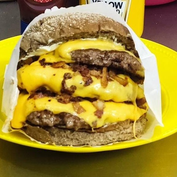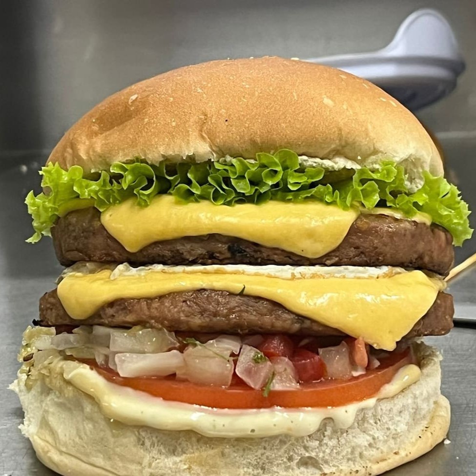 Pão, 2 deliciosos hambúrgueres 120g, queijo, ovo, vinagrete, alface, tomate, maionese