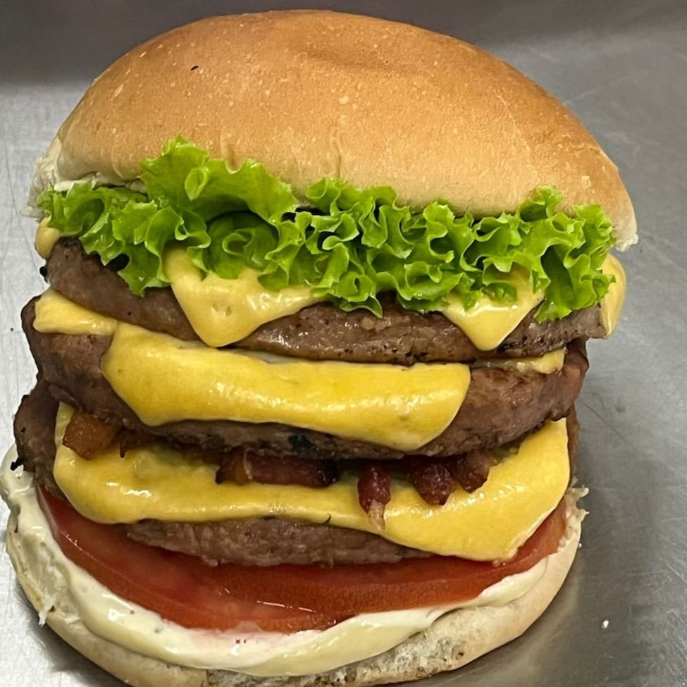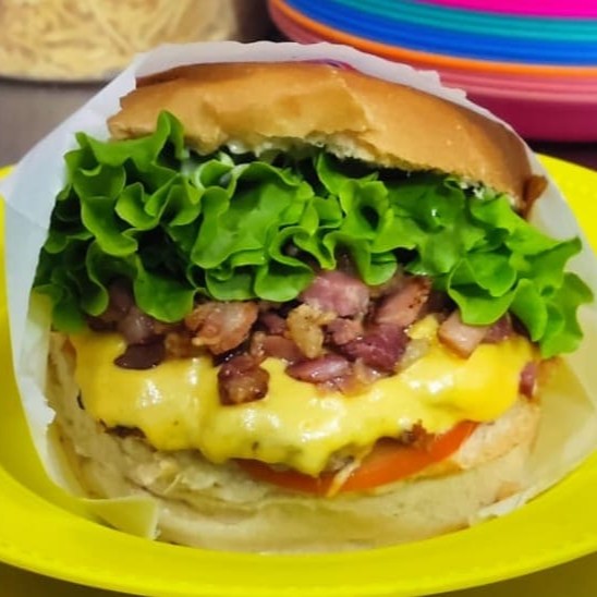 Pão, 3 deliciosos hambúrgueres 120g, queijo, bacon, alface, tomate, maionese