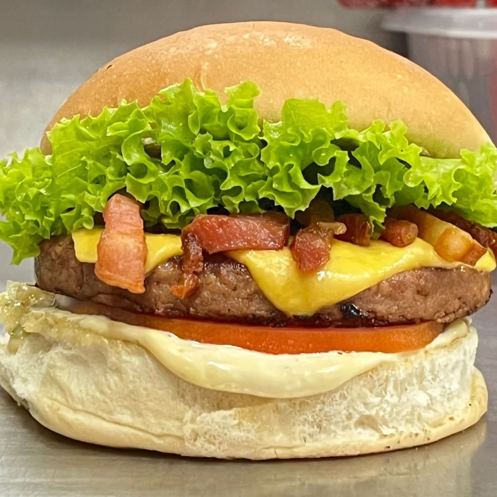 Pão, delicioso hambúrguer 120g, queijo, bacon, alface, tomate, maionese