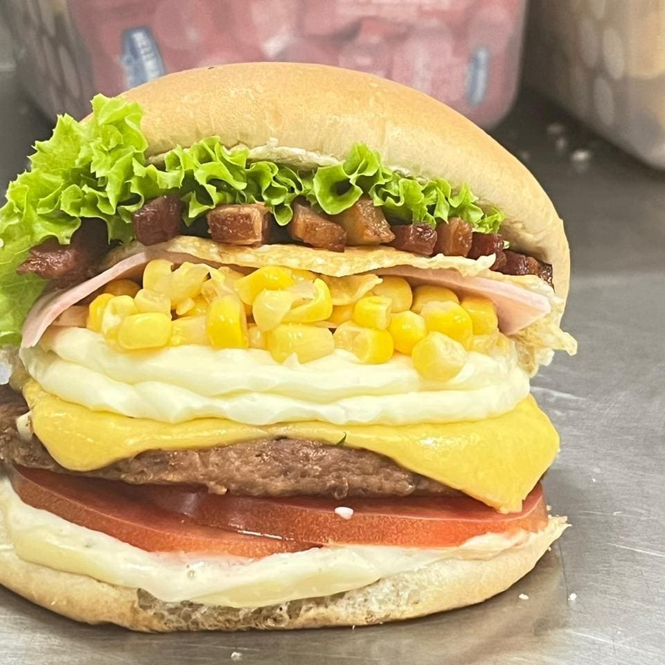 Pão, delicioso hambúrguer 120g, queijo, ovo, bacon, milho, Catupiry, presunto, alface, tomate, maionese