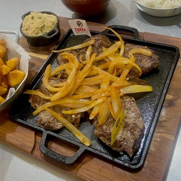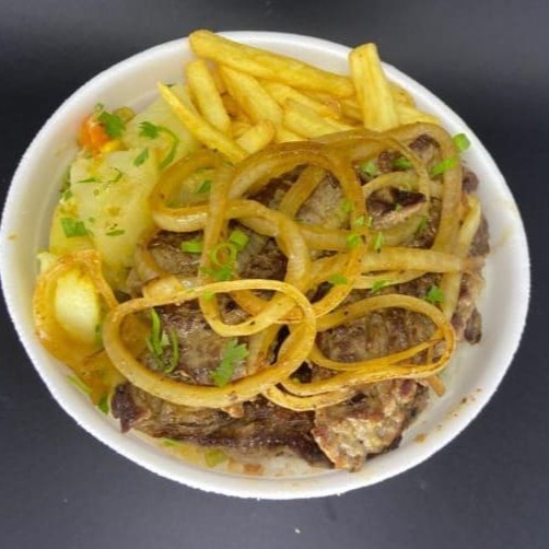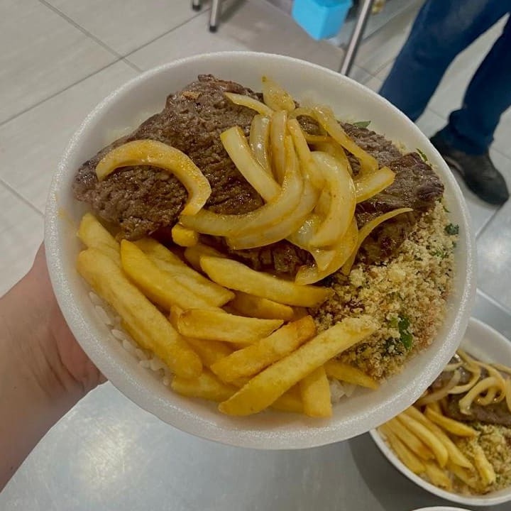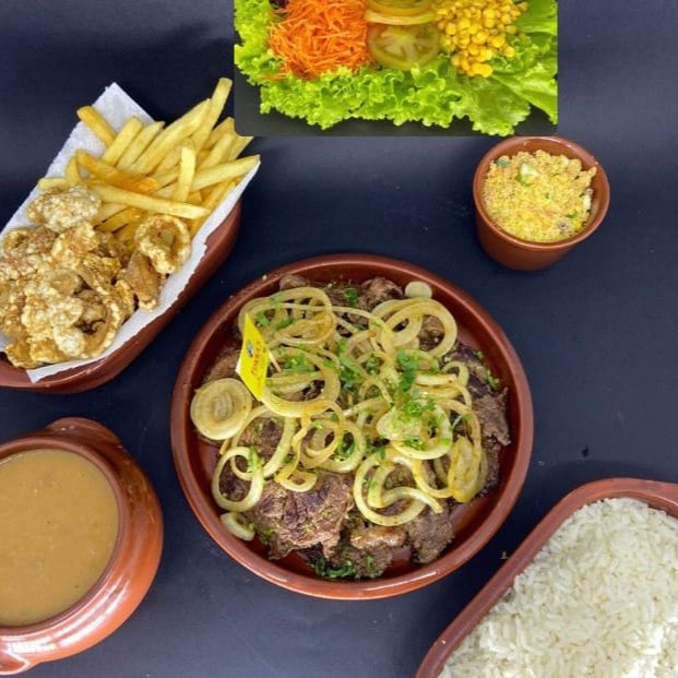 Acompanha salada, arroz, feijão, contra filé acebolado (250g in natura), farofa temperada e ovo frito.