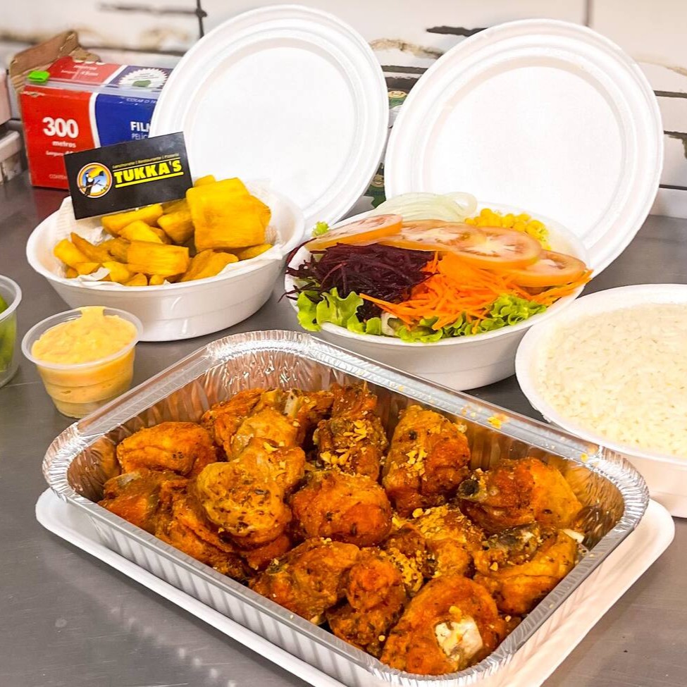 Um delicioso frango saboroso e suculento (1,3kg Cru). Acompanha arroz branco, mandioca frita e salada.