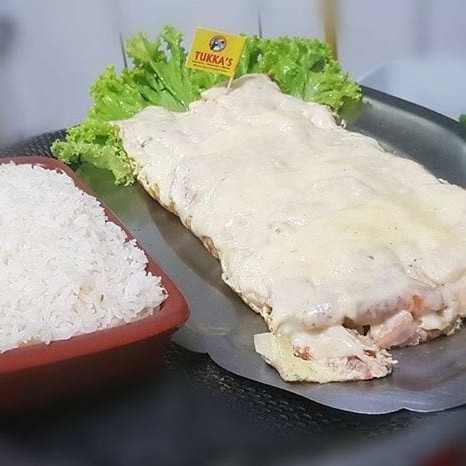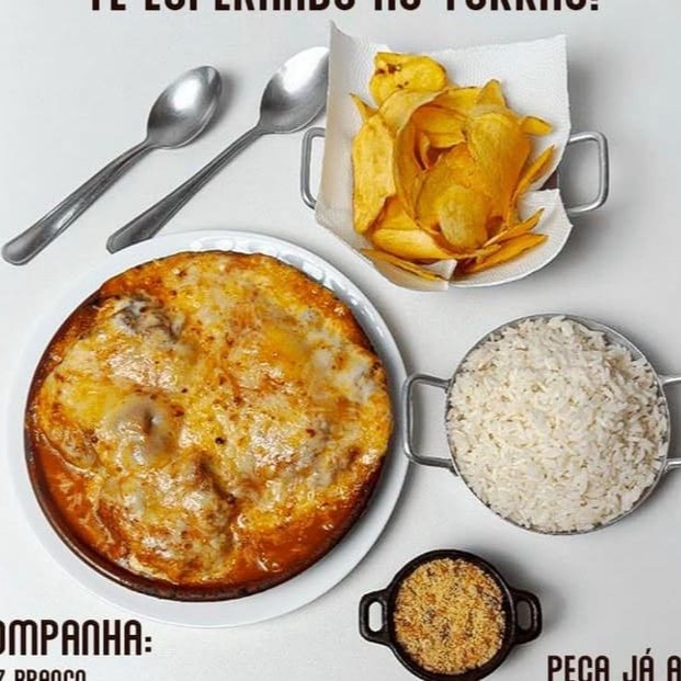 Frango desfiado, mussarela, Catupiry, cebola, salada e torradas. Gratinado com queijo. Acompanha arroz.