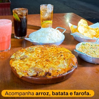Acompanha arroz branco, farofa e batata chips (prato para 2 pessoas )