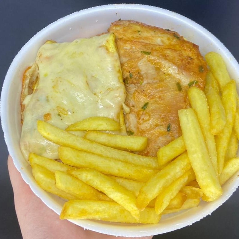 Meio quilo de file mignon a parmegiana suculento, arroz, farofa deliciosa, e batata chips (serve até 3 pessoas)