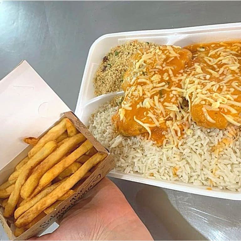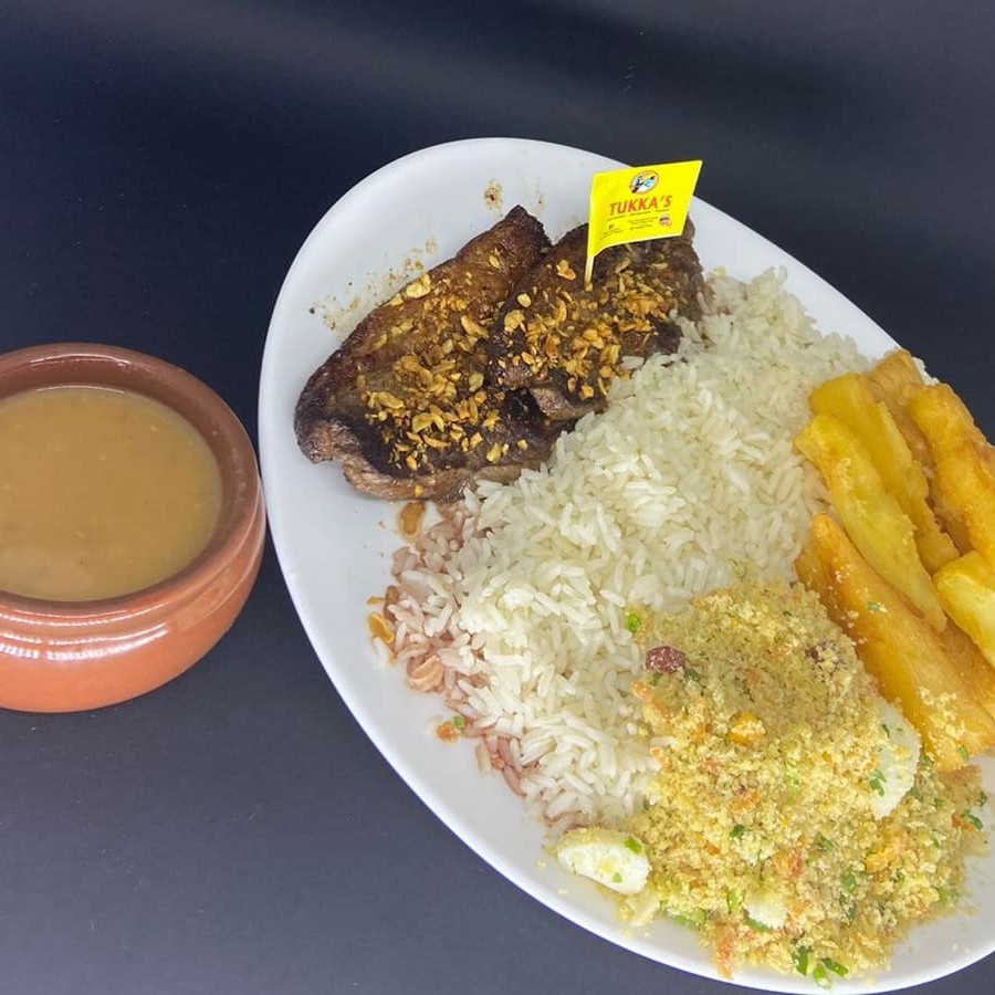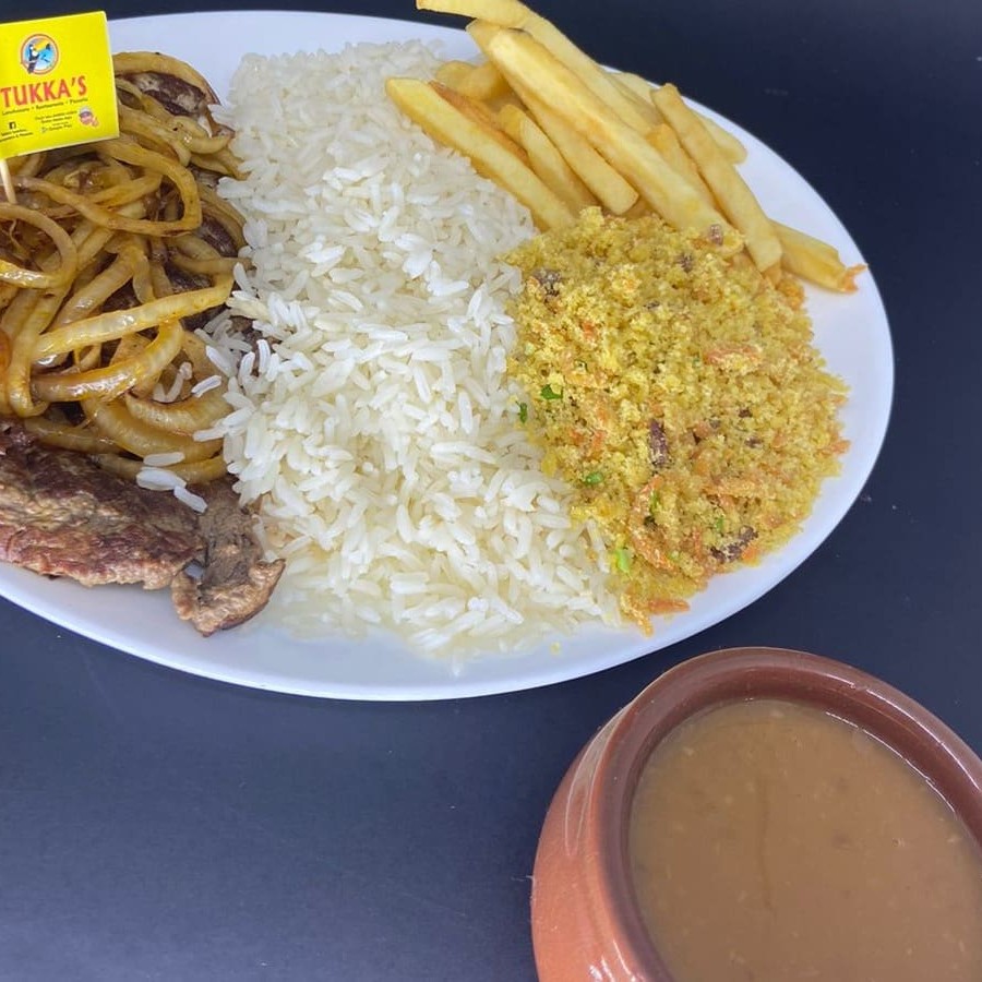 Acompanha arroz, batata chips e farofa.