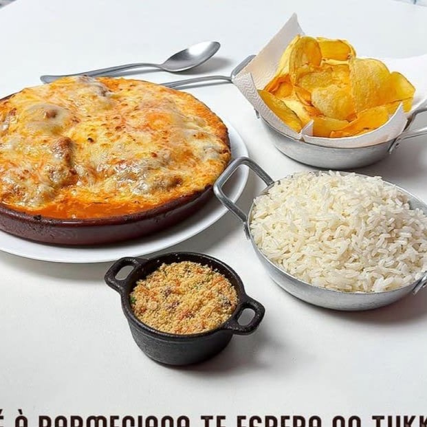 Acompanha arroz, feijão, parmegiana da sua escolha, batata chips e farofa.