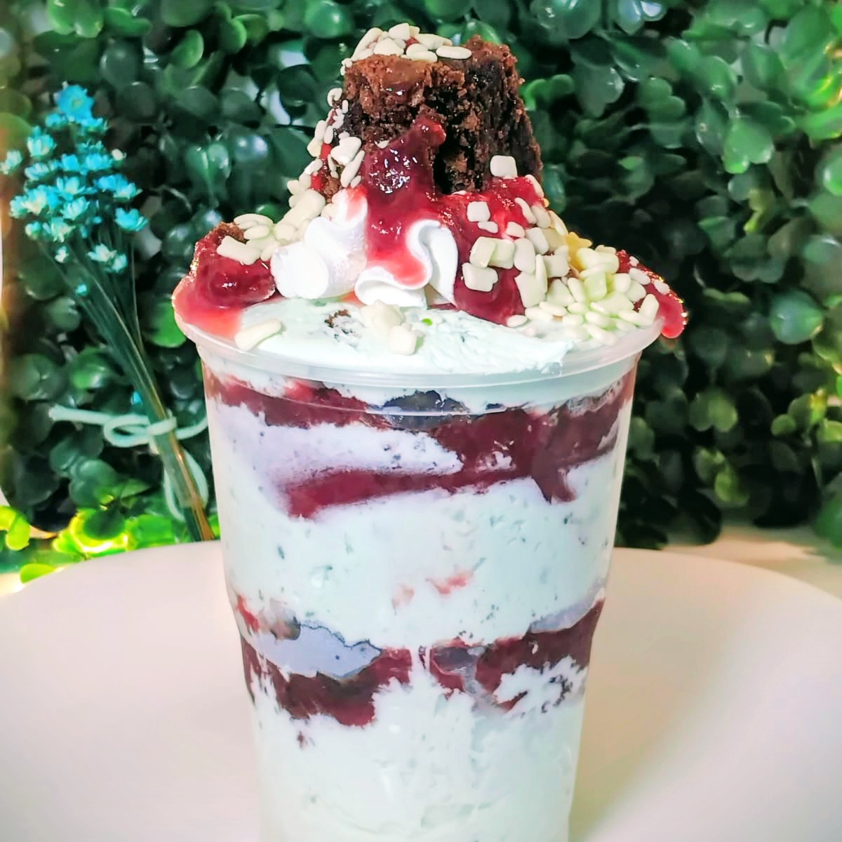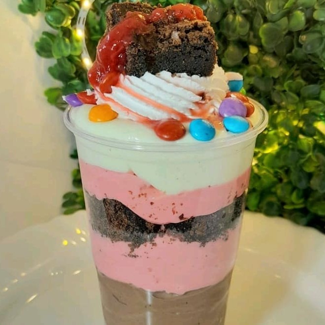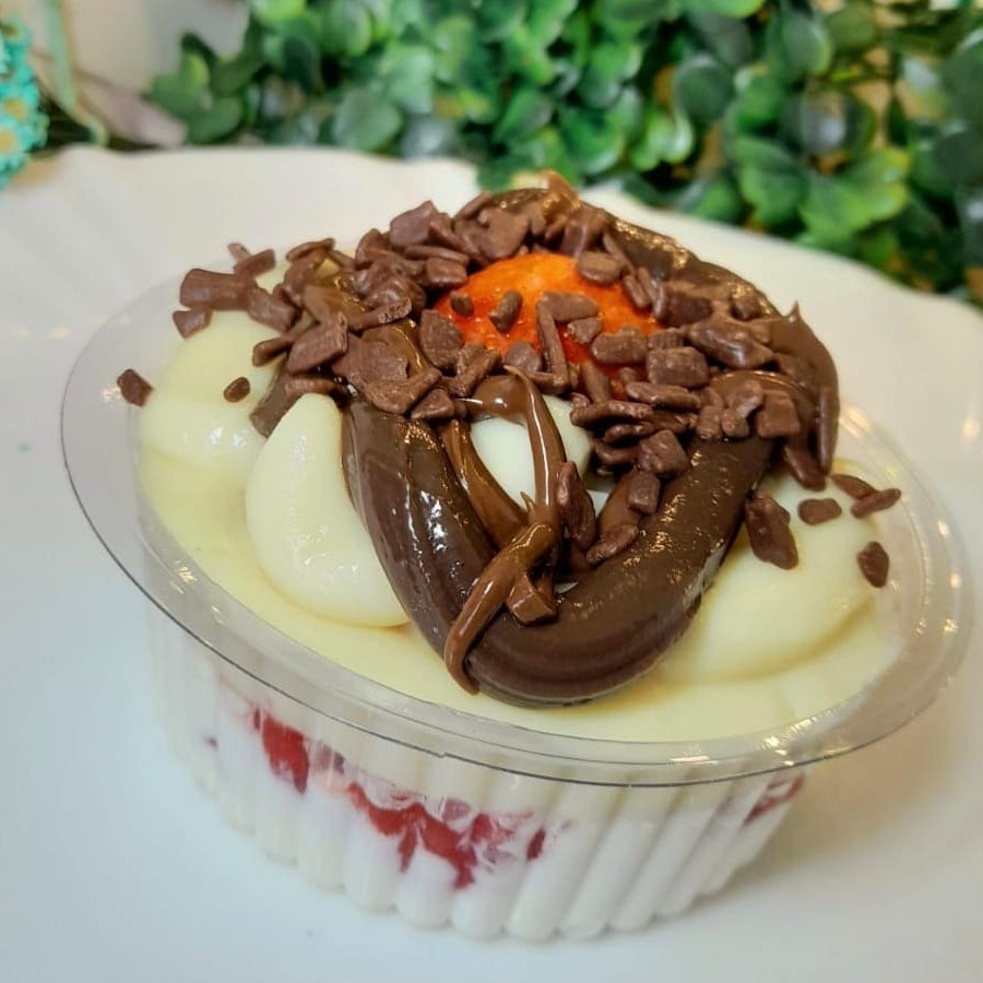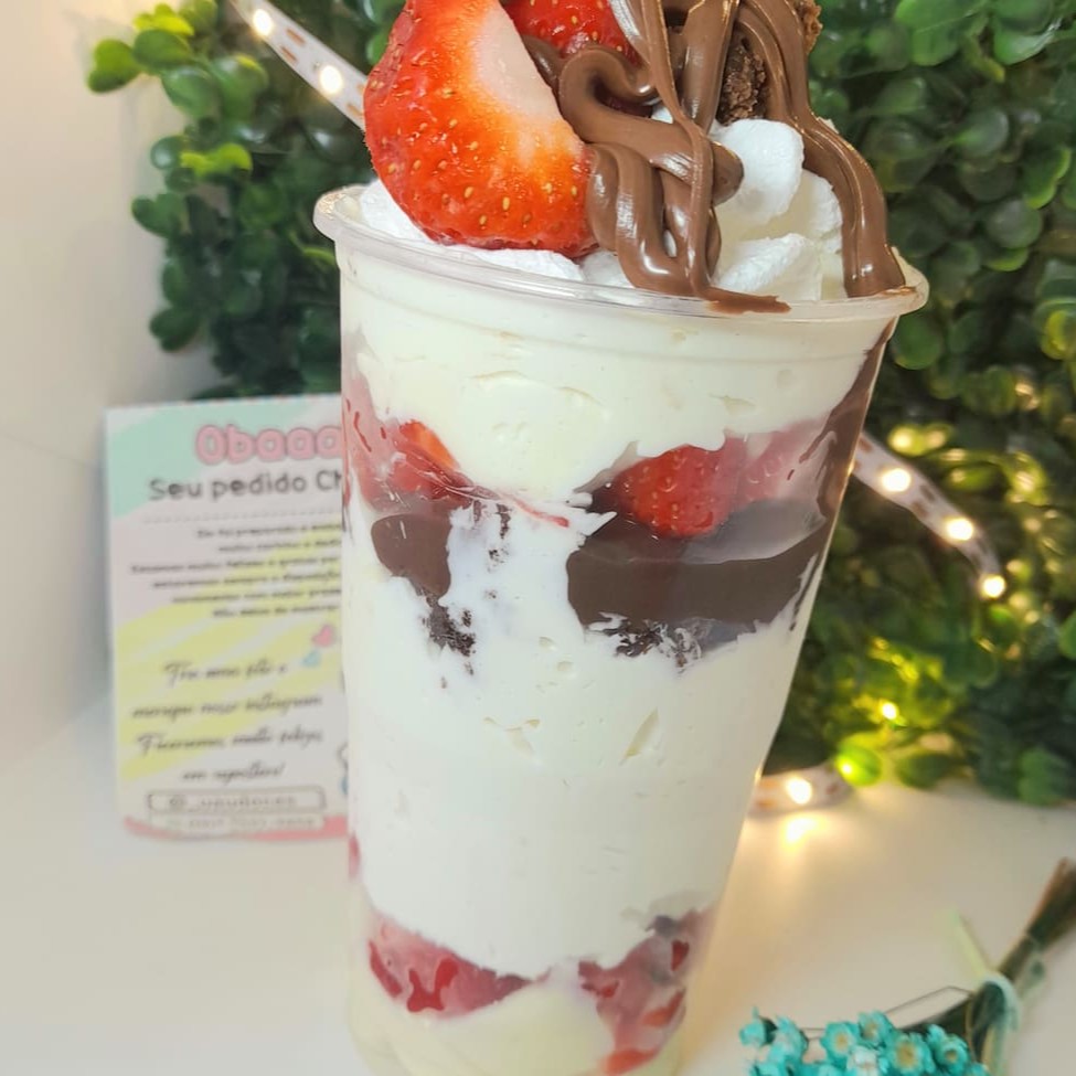 Nesse maravilhoso copo experimente a deliciosa combinação de mousse de chocolate, mousse de morango e mousse de Ninho finalizado com brownie geleia natural de morango e chantilly