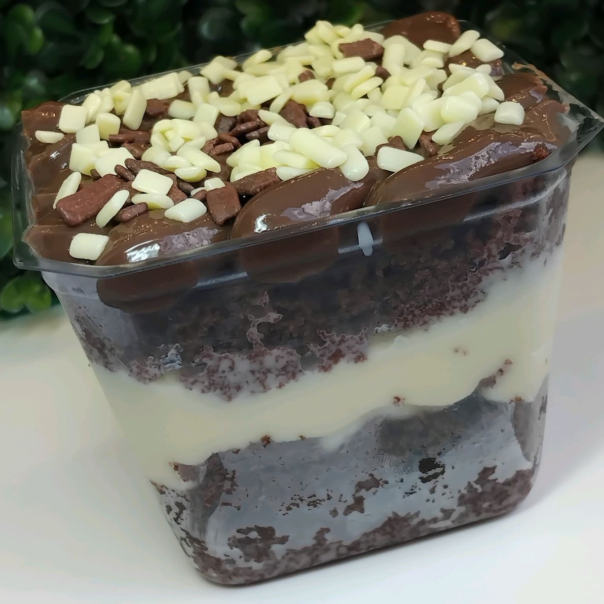 Saboroso Bolo no Pote Dois Amores, apresenta uma irresistível combinação de brigadeiro gourmet preto e branco. Este delicioso contraste de sabores é complementado por uma generosa cobertura de granulado mesclado. Perfeitamente equilibrado, este bolo no pote é o convite perfeito para um momento. Aprecie sem moderação, pois cada colherada deste bolo é uma experiência de sabor inesquecível!