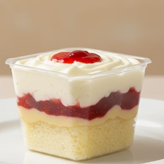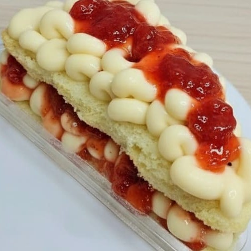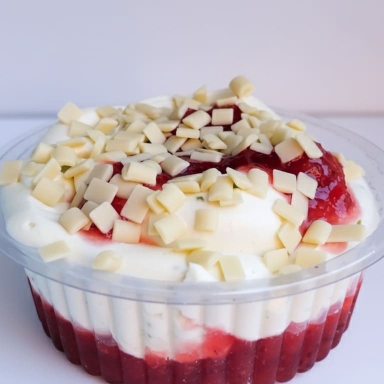 Massa branca de baunilha, recheio de Ninho coberto com geleia natural de morango.