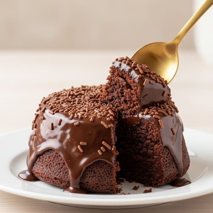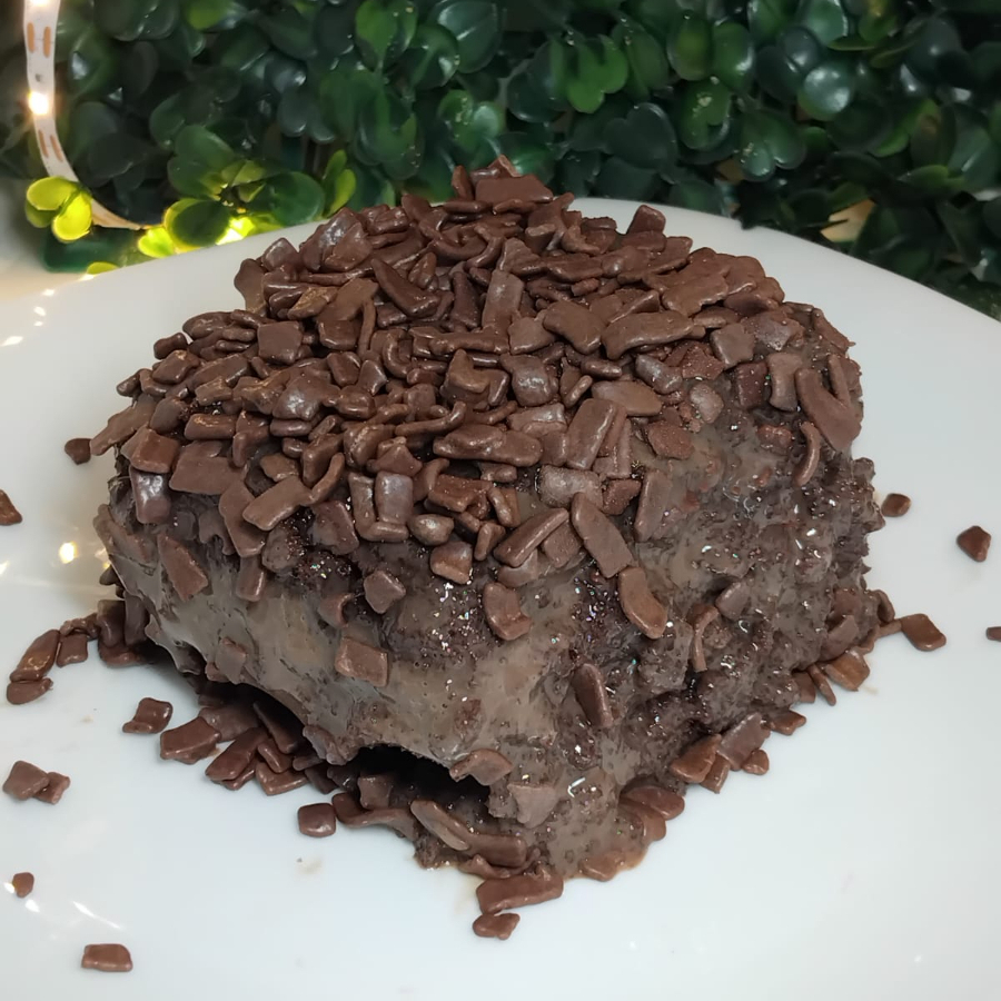 Massa de chocolate bem molhada com calda de chocolate e coberto com granule