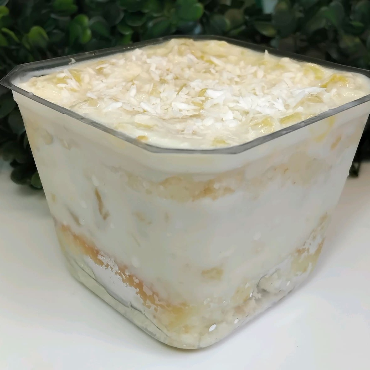 Delicioso creme branco com pedaços de abacaxi cozido, Coco ralado e massa branca.