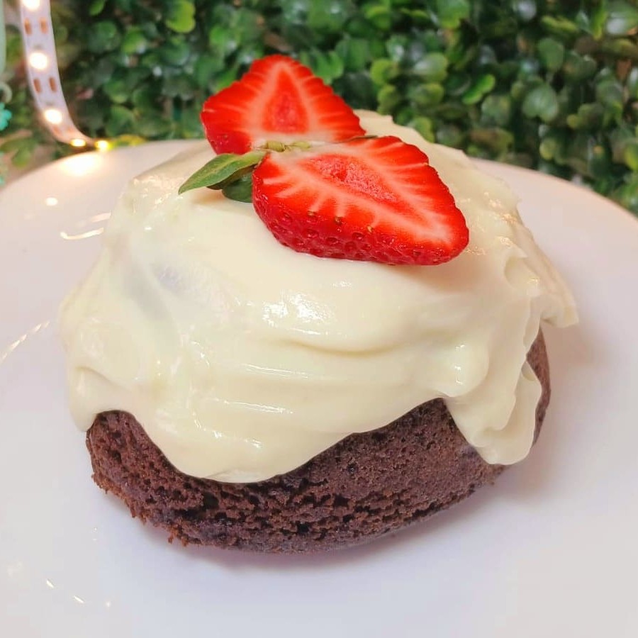 Mini bolo vulcão servido quentinho, com cobertura de Ninho e pedaços de Morango fresco, aprox 250g