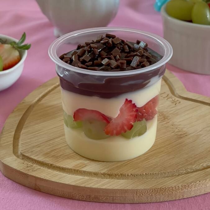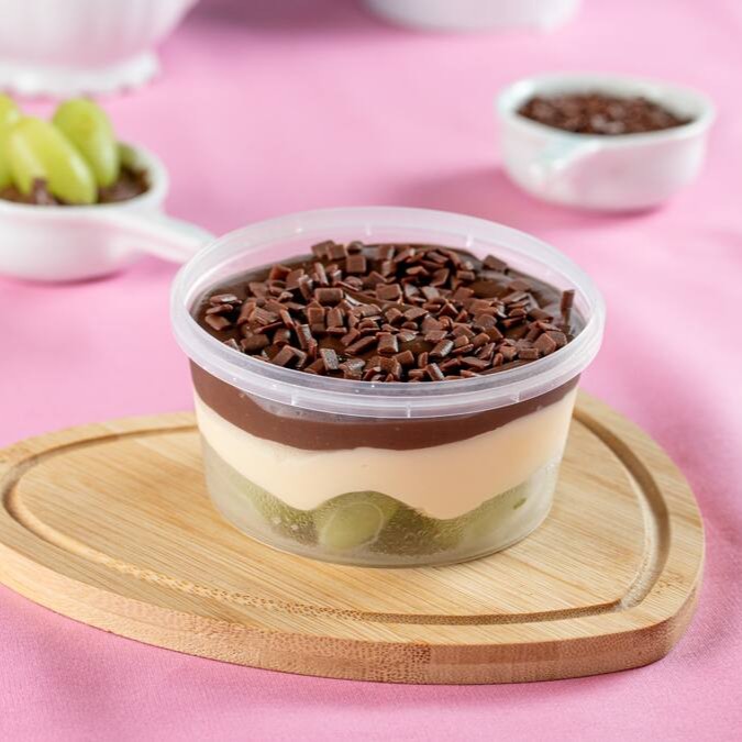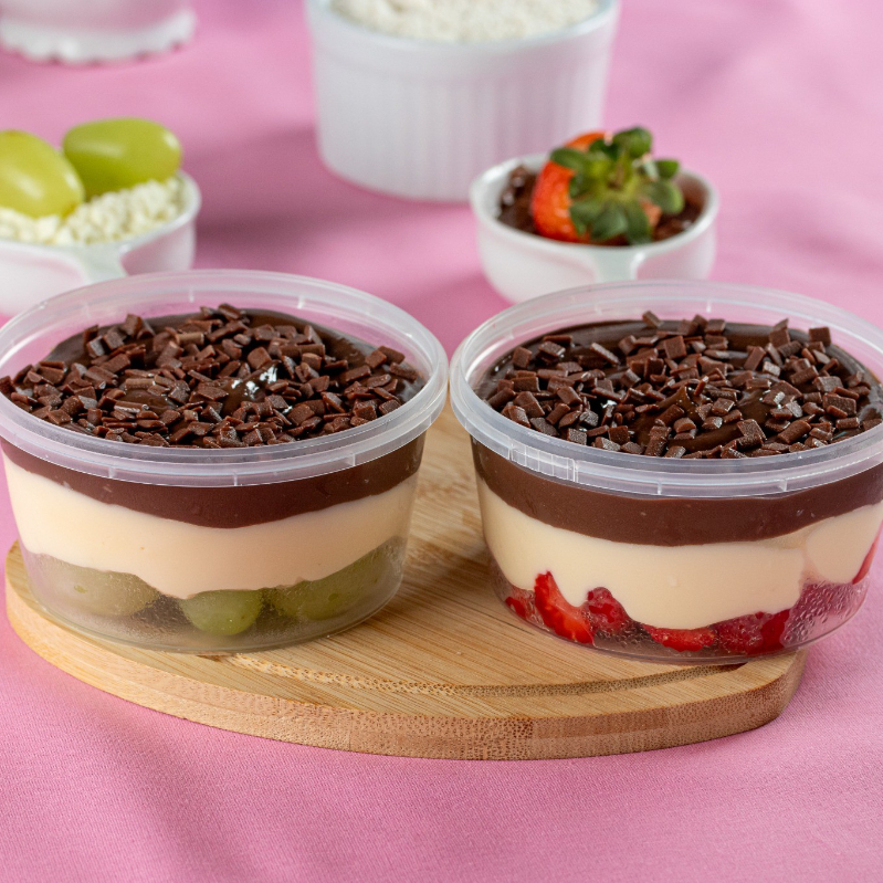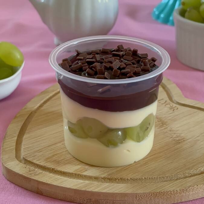 A sobremesa que preenche seu paladar com contrastes! Camadas perfeitas de uva verde docinha sem caroço, brigadeiro branco extra cremoso, brigadeiro preto cremoso.