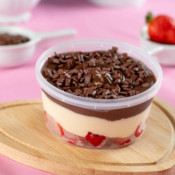 Camadas de Brigadeiro Branco e Brigadeiro de Chocolate, acompanhadas por morangos frescos e selecionados. Uma experiência gourmet irresistível em cada colherada. Peça agora e delicie-se com essa combinação única.