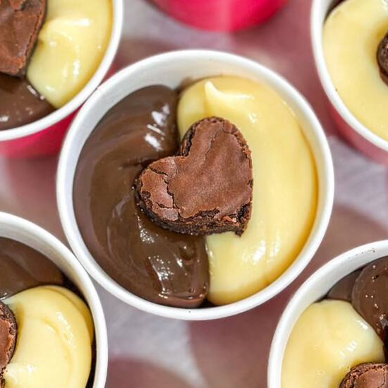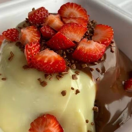 Brigadeiro branco + brigadeiro de chocolate + morangos frescos. Uma combinação cremosa, intensa e apaixonante — difícil mesmo é parar na primeira colherada.