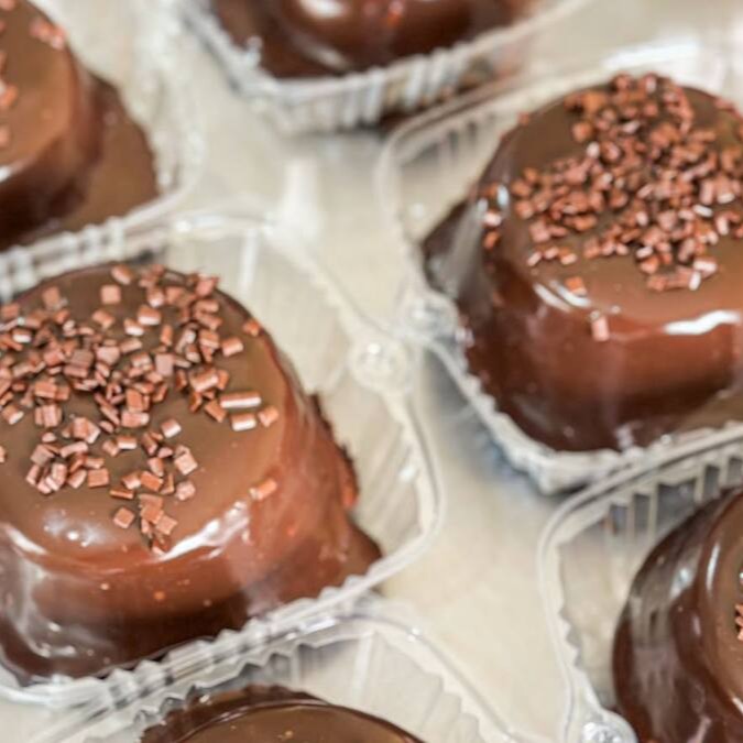 Massa de chocolate super fofinha com cobertura cremosa de brigadeiro belga ao leite, decorado com granulados de chocolate meio amargo para um toque especial.