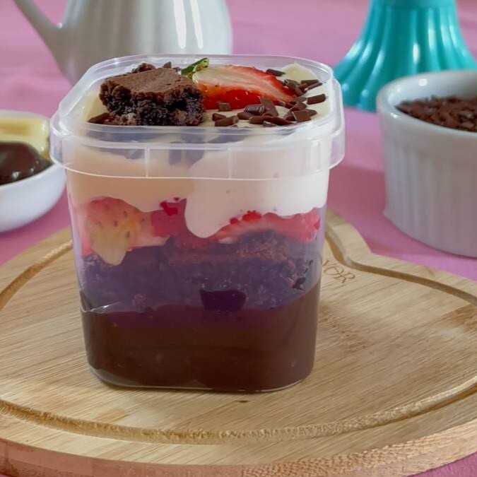 Uma explosão de sabores em cada camada! Composto por brigadeiro belga, mousse de Ninho, brownie de chocolate 50%, brigadeiro de Ninho e finalizado com morangos frescos. Peso: 250ml *Favorite nossa loja e receba promoções exclusivas.