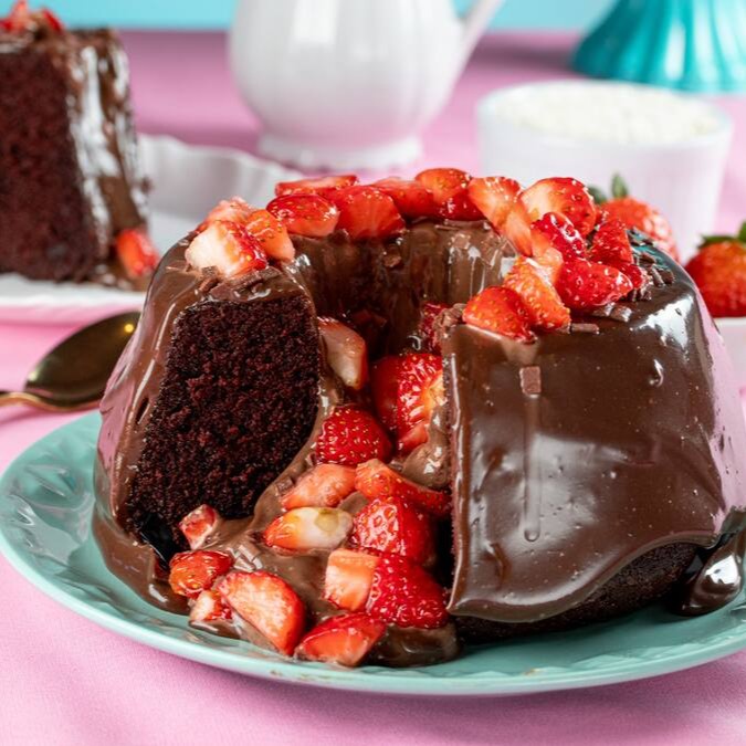 Massa fofinha de Chocolate, com Cobertura de Brigadeiro Ao Leite Belga Cremoso, Morangos Frescos e Granulados Ao Leite.