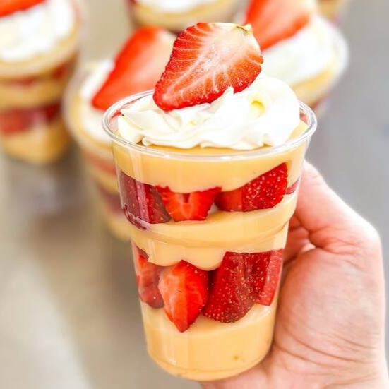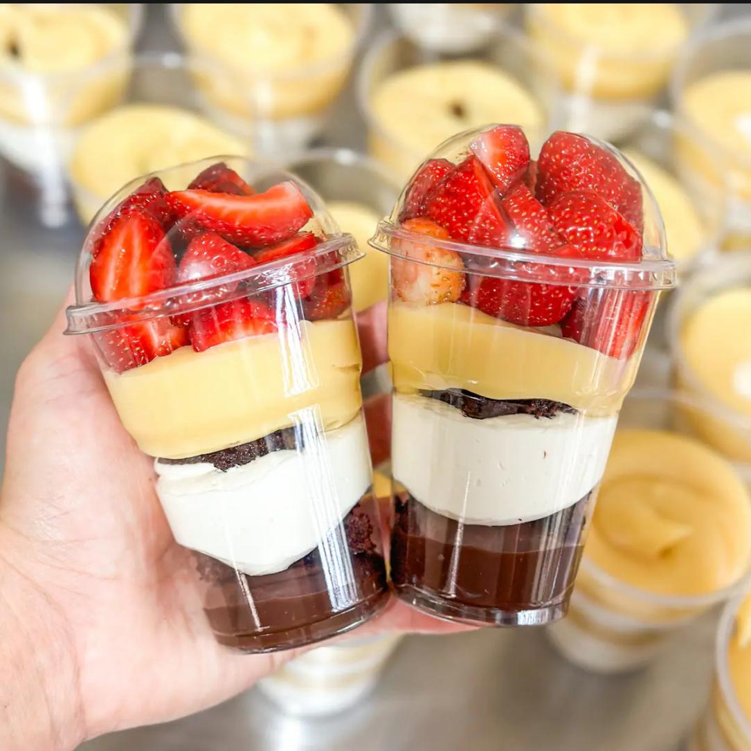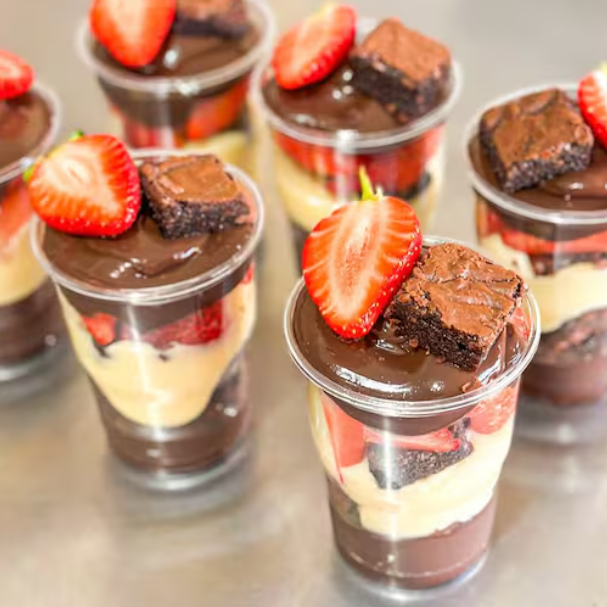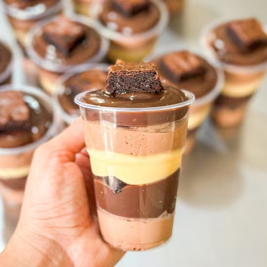 Uma sobremesa irresistível com camadas de brigadeiro belga, morangos frescos, pedacinhos de brownie, brigadeiro de Ninho e mousse cremoso de Ninho. Finalizada com morango, pedaços de brownie e granulado belga.