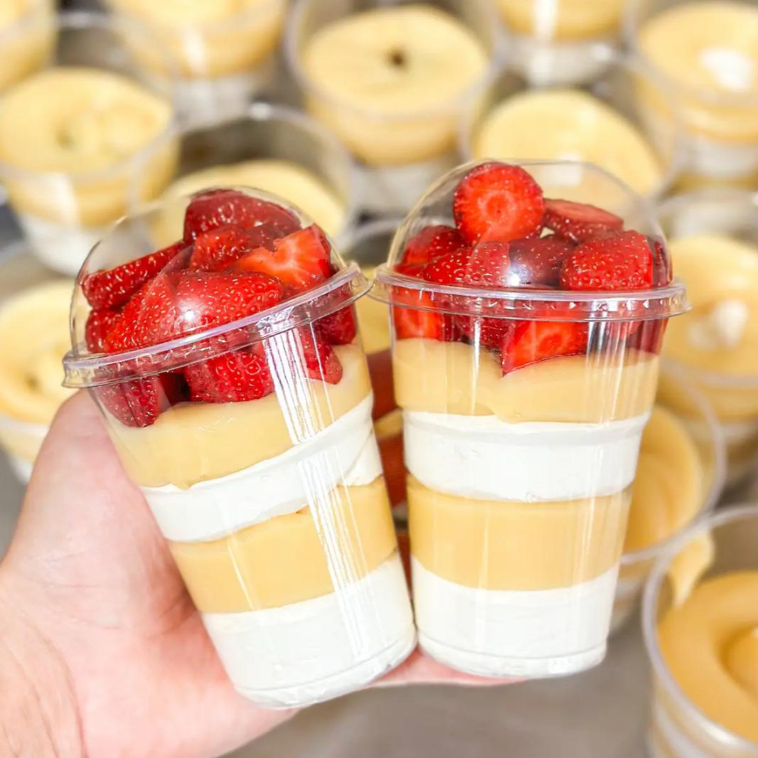 Camadas de Brigadeiro Branco e Brigadeiro de Chocolate, acompanhadas por morangos frescos e selecionados. Uma experiência gourmet irresistível em cada colherada.