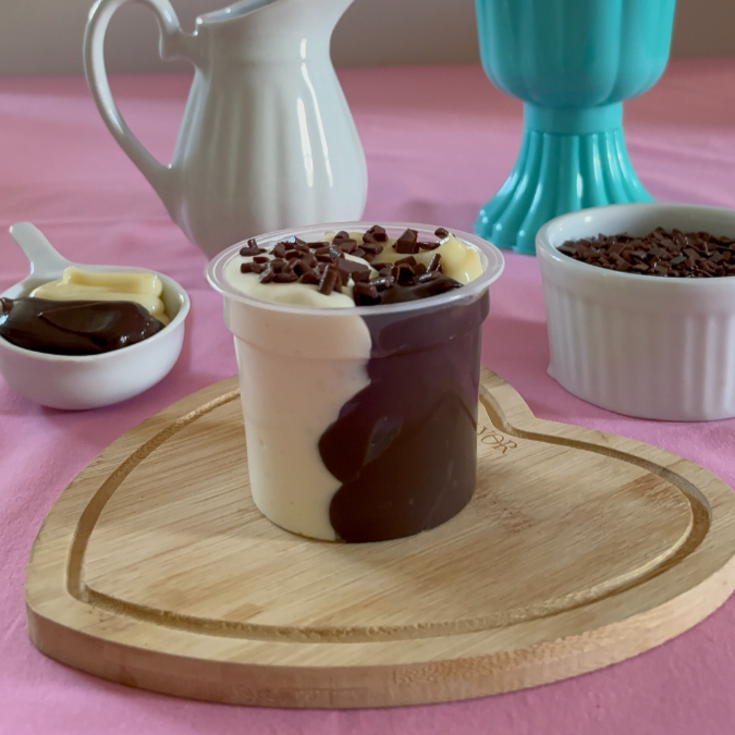 Brigadeiro branco + brigadeiro de chocolate + uvas frescas. Uma combinação cremosa, intensa e apaixonante — difícil mesmo é parar na primeira colherada.