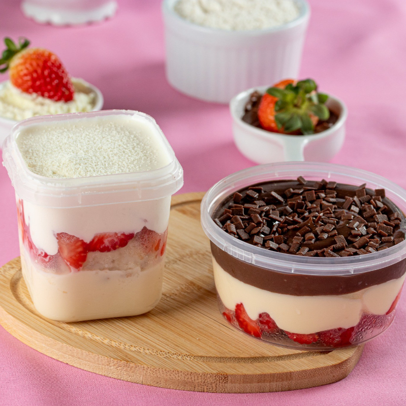 Combo com 2 sobremesas deliciosas! - Composto por 1 Bolo no Pote de Morango com Mousse de Ninho (Bolo Branco, Morangos Frescos e Brigadeiro Branco) e 1 Bombom de Morango - (Brigadeiro Belga Cremoso, Brigadeiro Branco e finalizado com Granulado Ao Leite. *Favorite nossa loja e receba prmoções exclusivas. Serve 2 pessoas (570g)