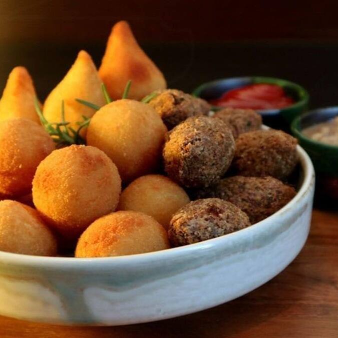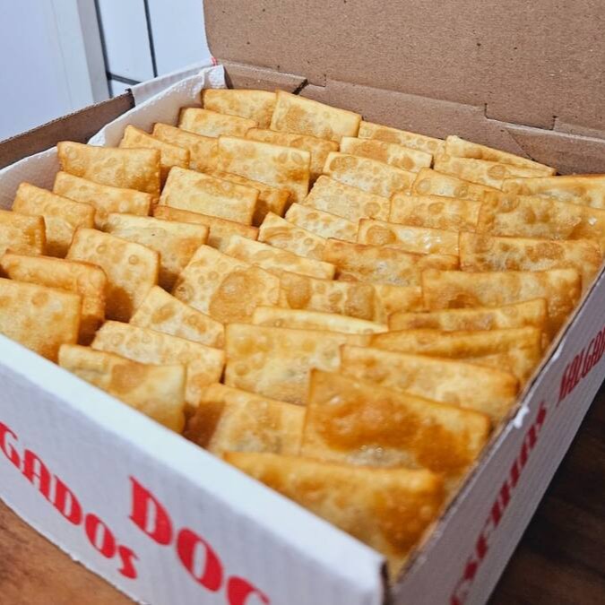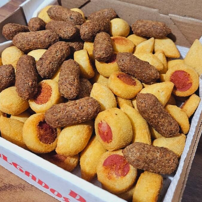 Sabores: Coxinha de Frango, Bolinha de Queijo, Presunto e Queijo, Risoles de Carne, Kibe, Salsicha, Brócolis e Croquete de Calabresa