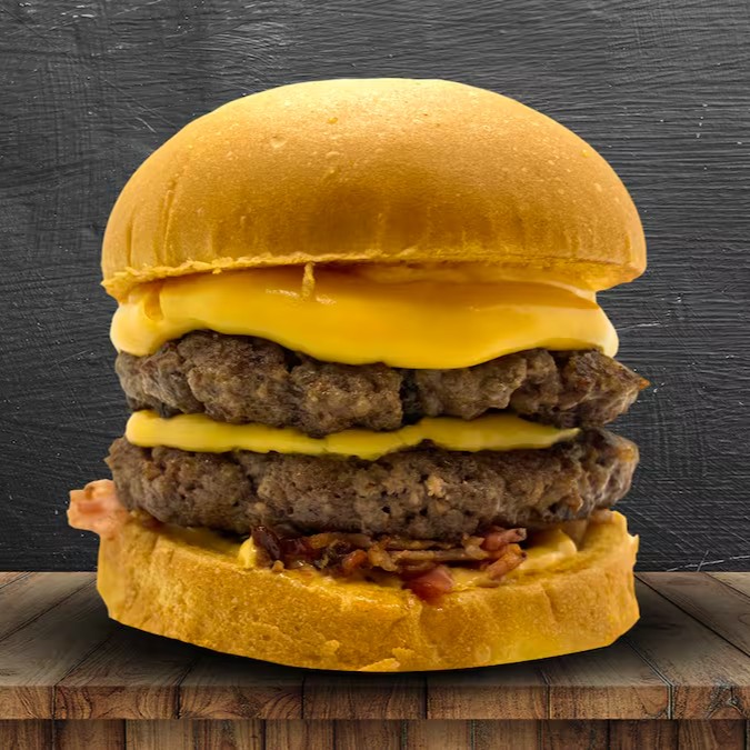 Pão brioche, 2 carne angus 150g, cheddar cremoso, bacon, ketchup, mostarda e molho especial.