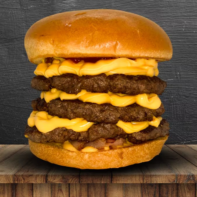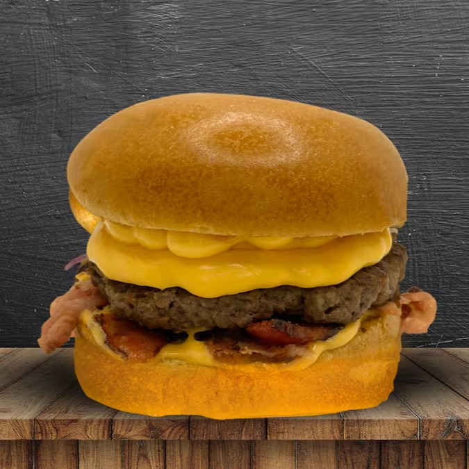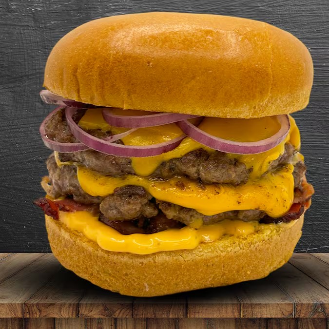 Pão brioche, 3 carne angus 150g, 6 queijos cheddar fatiado, bacon, cebola roxa, ketchup, mostarda e molho especial.
