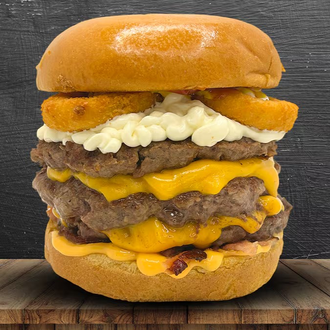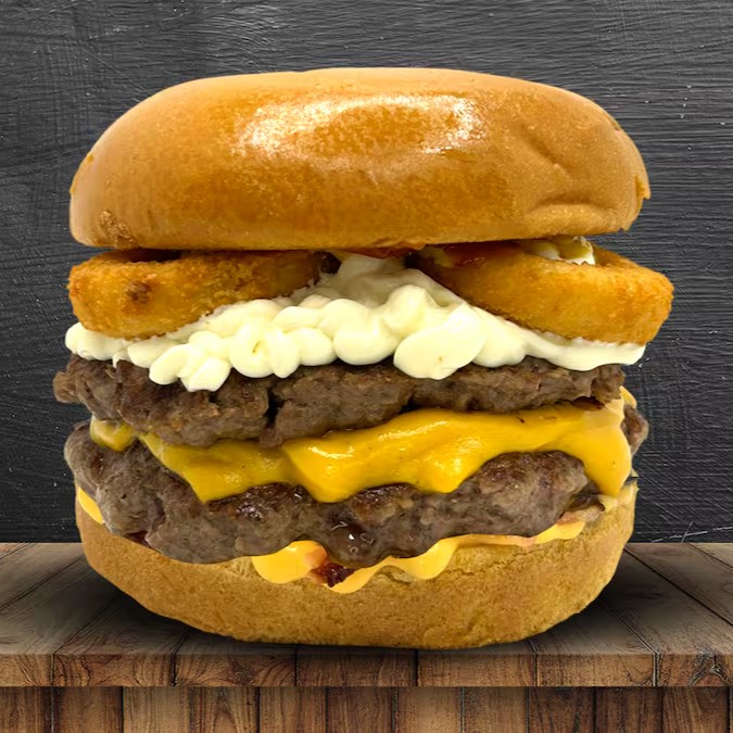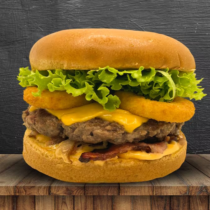 Pão brioche, 3 carne angus 150g, 6 queijos cheddar fatiado, bacon, 3 onions rings, cebola roxa, alface, molho especial, ketchup e mostarda