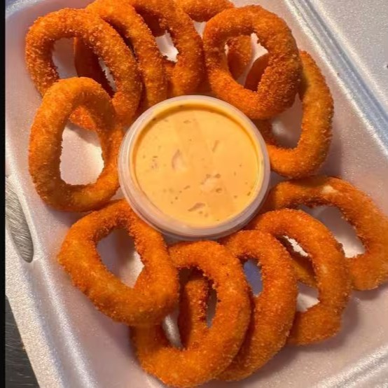 12 anéis de cebola empanado + pote de molho especial 75ml.