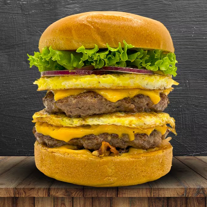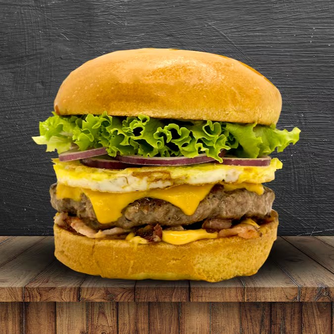 Pão brioche, 2 carne angus 150g, 4 queijo cheddar fatiado, 2 ovo, bacon, alface, cebola roxa, ketchup, mostarda e molho especial.
