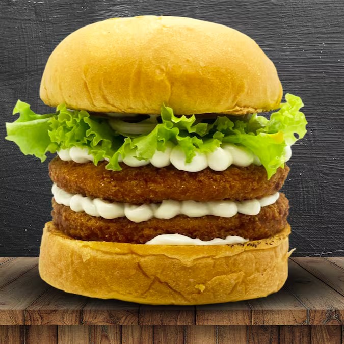 Pão brioche, 2 hambúrguer de frango empanado sadia, cream cheese, alface, cebola roxa, picles, ketchup, mostarda e molho especial.