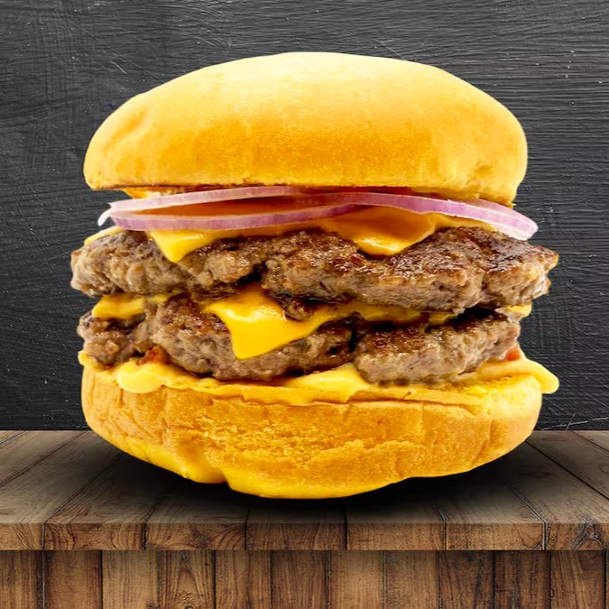Pão brioche, 2 carne angus 150g, 4 queijos cheddar fatiado, cebola roxa, ketchup, mostarda e molho especial.