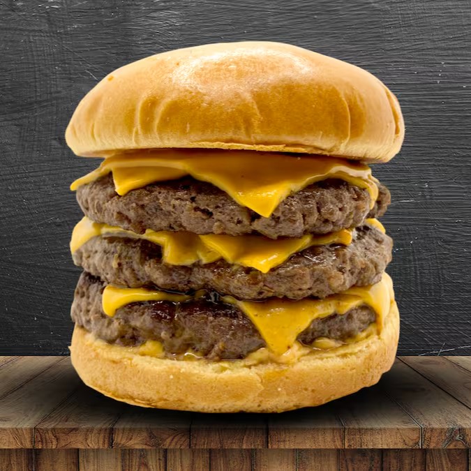 Pão brioche, 3 carne angus 150g, 6 queijos cheddar fatiado, cebola roxa, ketchup, mostarda e molho especial.