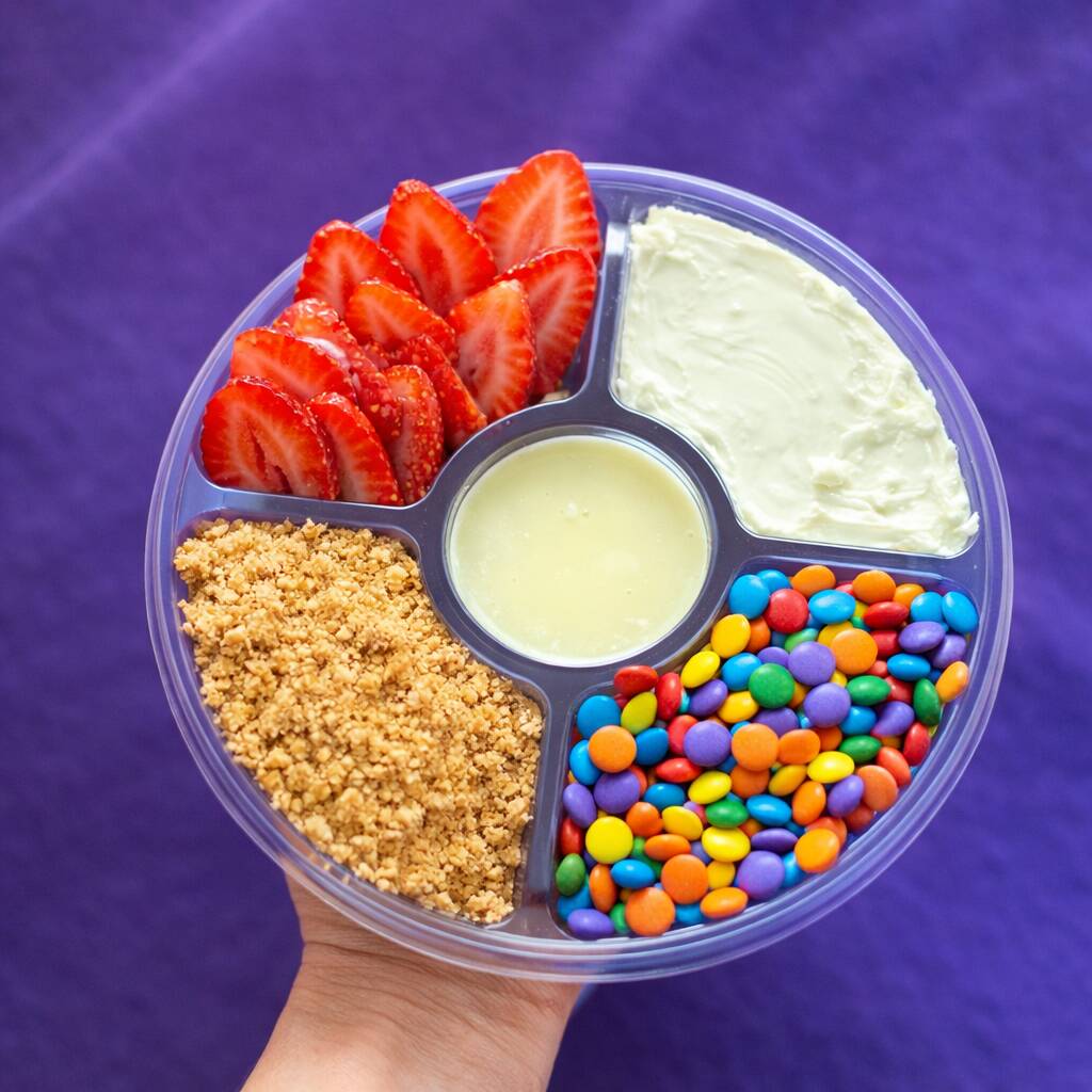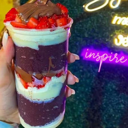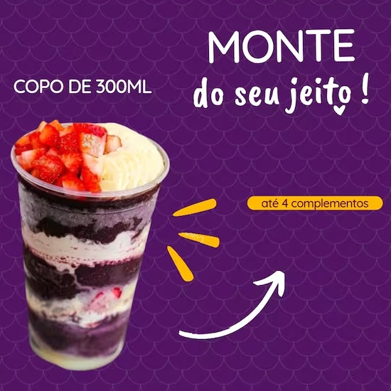 Escolha 4 acompanhamentos grátis, como frutas frescas (morango, banana, entre outras), cremes especiais (Nutella Original, creme de avelã, creme de Ninho), e complementos deliciosos, como paçoca, granola, leite em pó, ou chocolate trufado. Personalize do jeito que você ama e aproveite a excelência em cada colherada!