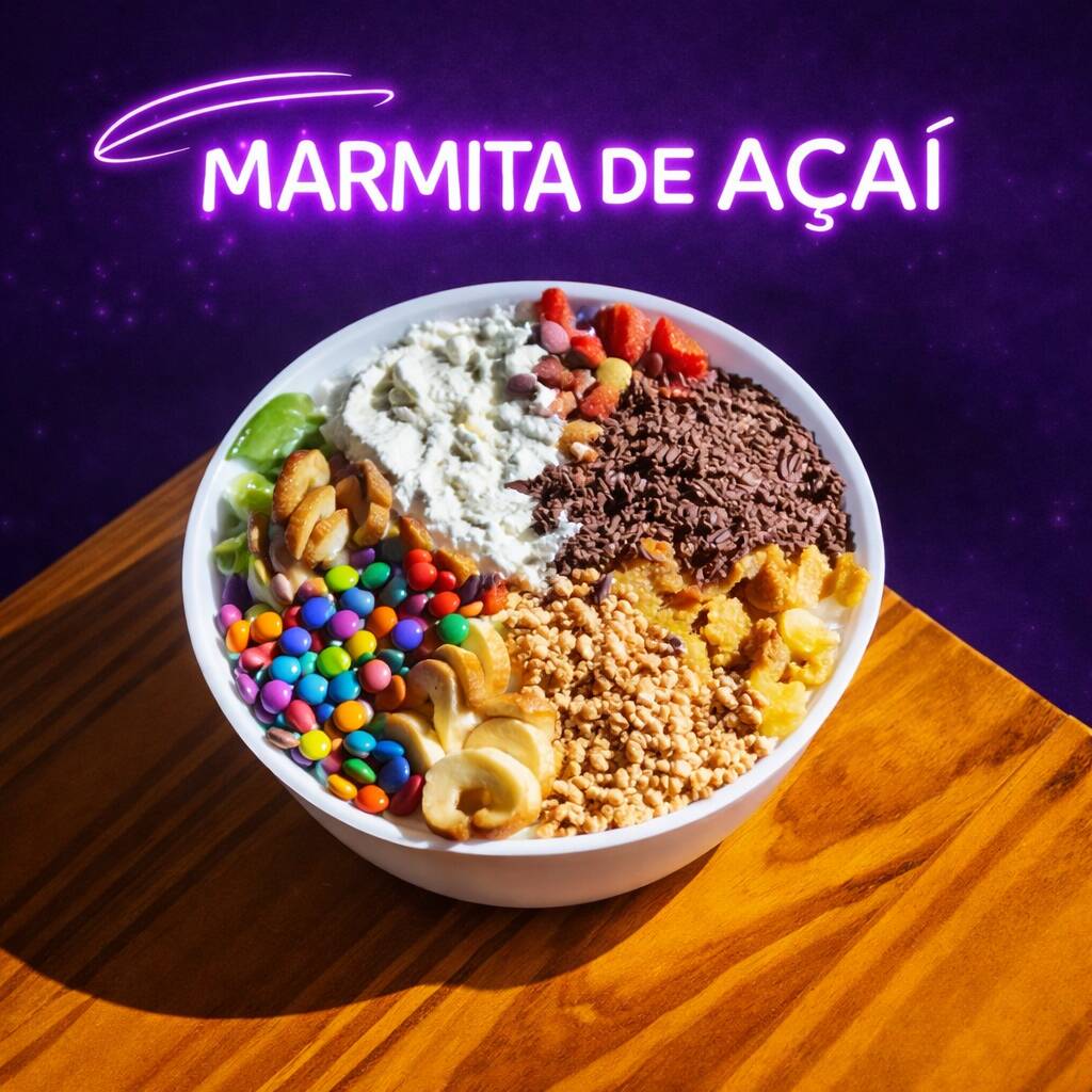 Super Marmita de Açaí Grande (500ml) – Uma experiência de sabor incrível! Prepare-se para uma explosão de sabores em cada colherada. Nosso Super Marmitex de Açaí é cremoso, super recheado e vem com o dobro de recheio nos ingredientes que você escolher+ creme de avelã gratis cremoso Para completar, escolha até 4 acompanhamentos gratuitos e crie a combinação perfeita do seu jeito! Peça agora e se delicie com essa maravilha personalizada!perfeita. Ideal para quem adora um açaí farto, delicioso e cheio de personalidade! .