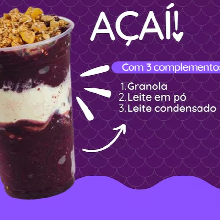 Açaí no Copo 300ml – (Granola + Leite Condensado+ Leite Em Pó) Açaí refrescante e cremoso, acompanhado pela crocância da granola, a doçura irresistível do leite condensado e o toque suave do leite em pó. Uma explosão de texturas e sabores para qualquer momento do Dia!