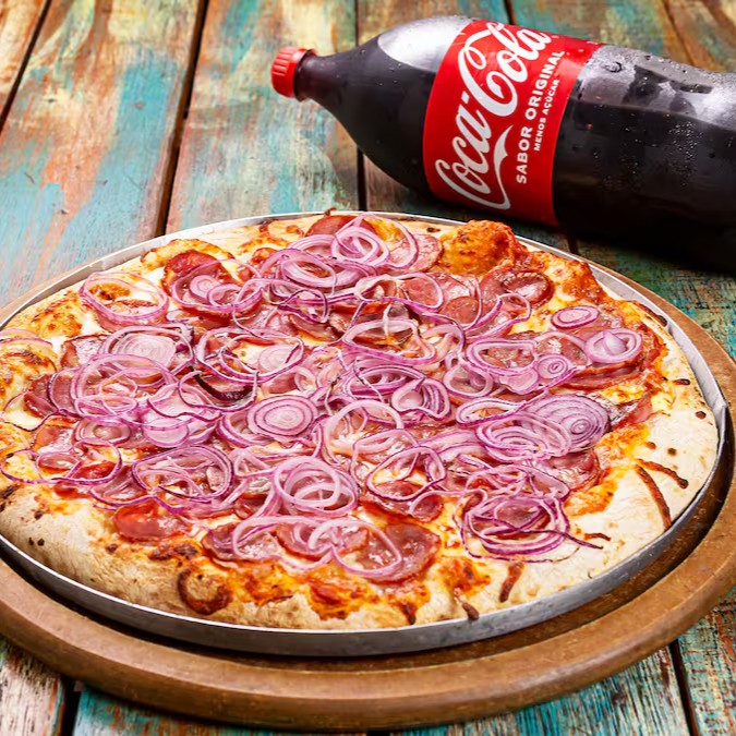 Exaltando a combinação perfeita entre a suavidade da muçarela, a tradicional linguiça calabresa, a 'Calabresa' é uma das nossas pizzas mais requisitadas. Com 8 generosas fatias, ela é o pedido perfeito para compartilhar momentos deliciosos com amigos e família. Além disso, você desfruta de uma cortesia especial: uma refrescante Coca-Cola de 2 litros, disponível em diversas opções. É a combinação ideal para uma refeição incrível!