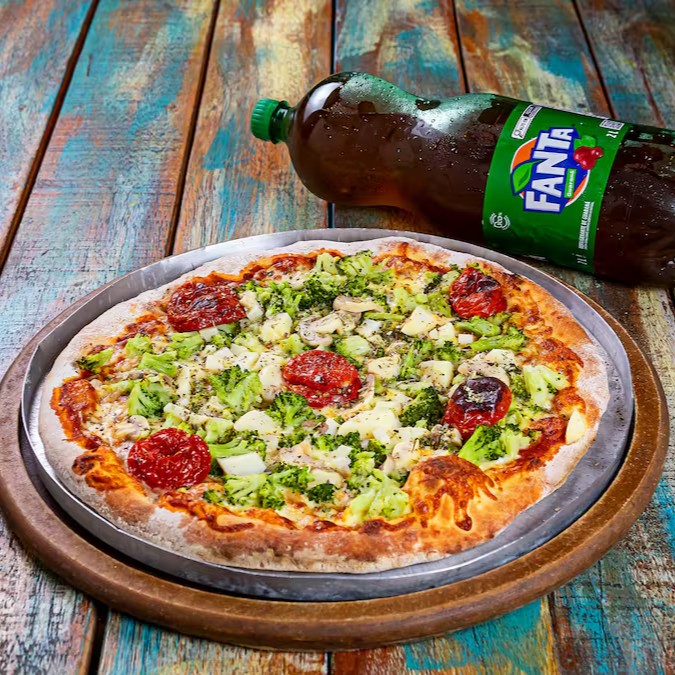 Exaltando a combinação perfeita entre a suavidade da muçarela, junto a um mix de itens vegetarianos, a 'Vegetariana' tem se tornado uma das nossas pizzas mais requisitadas. Com 8 generosas fatias, ela é o pedido perfeito para compartilhar momentos deliciosos com amigos e família. Além disso, você desfruta de uma cortesia especial: uma refrescante Coca-Cola de 2 litros, disponível em diversas opções. É a combinação ideal para uma refeição incrível!