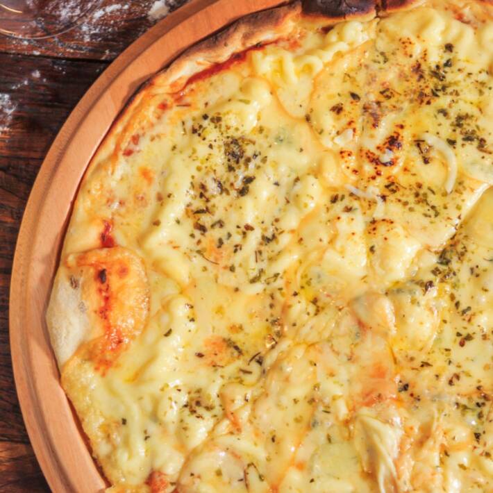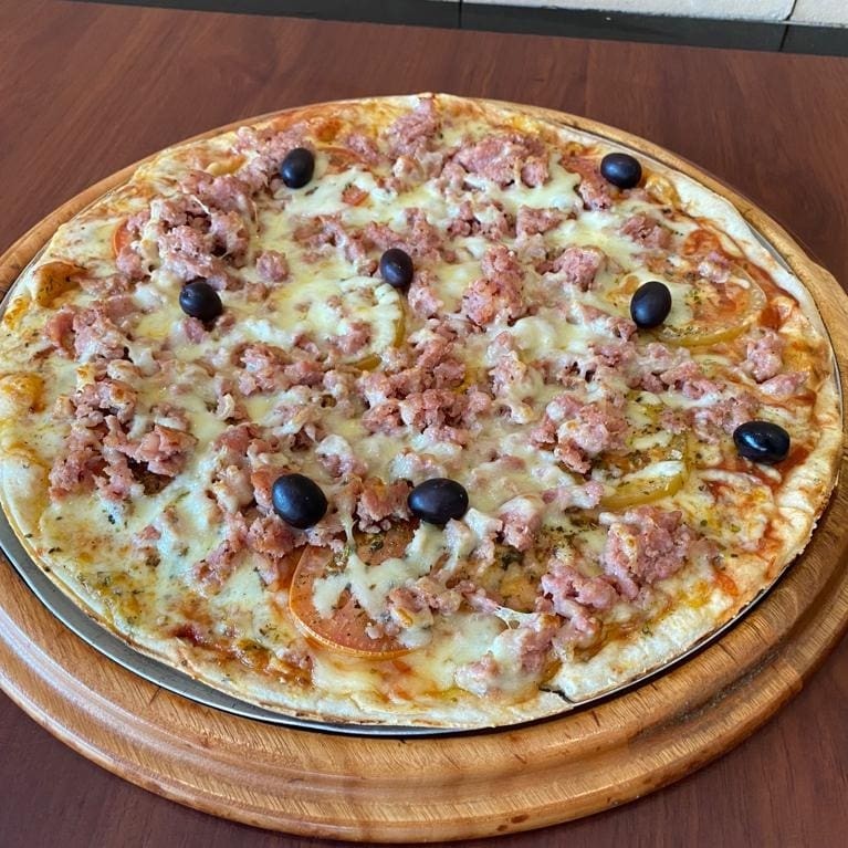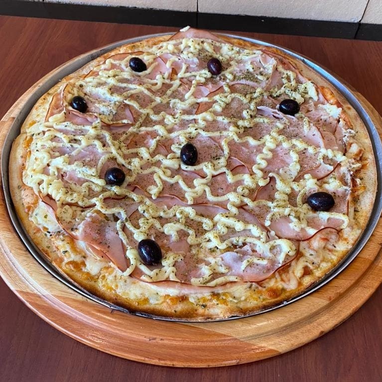 Pizza de muçarela com massa fininha, com molho de tomate, muçarela derretida e azeitonas, sobre uma massa bem assada. Clássica, leve e saborosa.