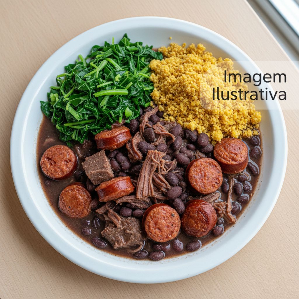 Arroz, feijoada, farofa temperada. torresmo, couve refogada, fatia de laranja e vinagrete