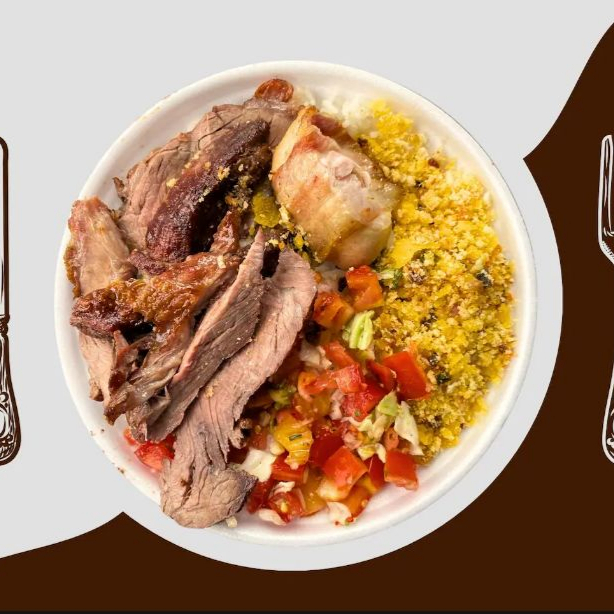 Acompanha arroz e feijão, 3 proteínas e 2 guarnições da sua escolha.