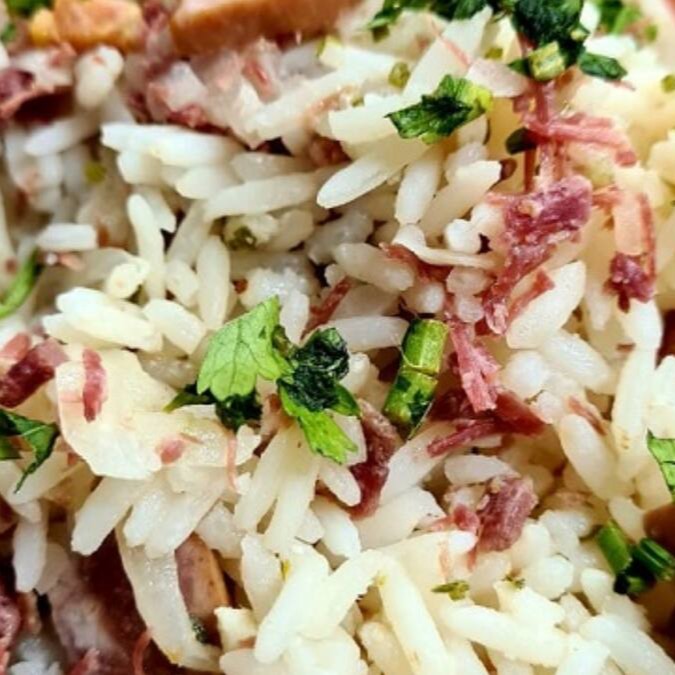 Arroz branco c/ manteiga, carne-seca e cheiro-verde.