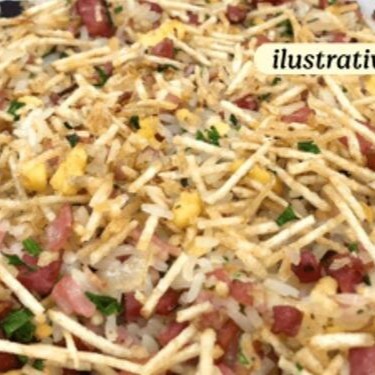 Delicioso arroz branco c/ bacon, ovos mexidos, salsinha e batata palha. Foto Ilustrativa.