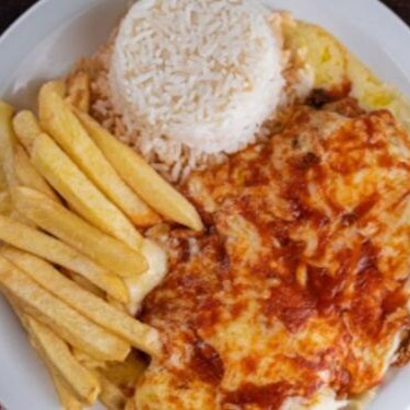 Queridinho do brasileiro. Filé de frango à parmegiana, com arroz e fritas.