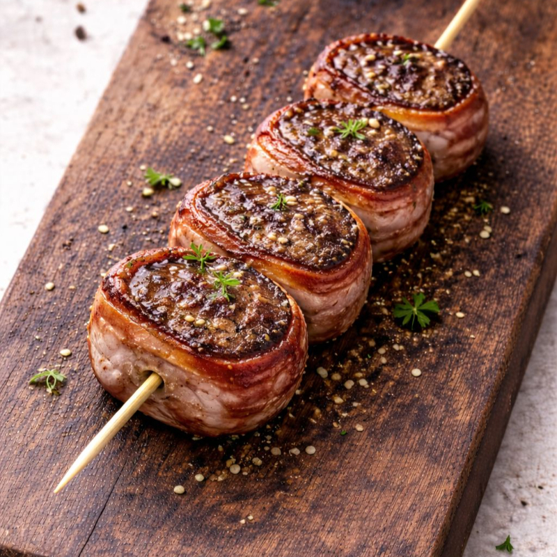 Espeto de Carne Enrolado no Bacon, uma Explosão de Sabor. Acompanha Pão, Vinagrete, Farofa, Molho de Pimenta, Molho de Alho.