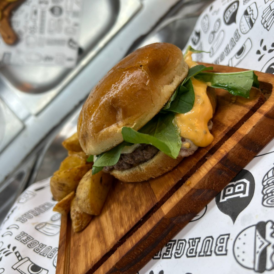 Pão de Brioche, Hamburguer Artesanal 180g feito na Brasa(Parrilla), Crips de Cebola, Cheddar, Molho da Casa, Rúcula.