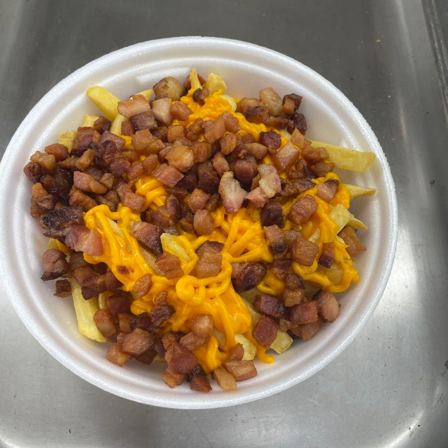 Generosa Porção de Batata frita com Chedder e Bacon.